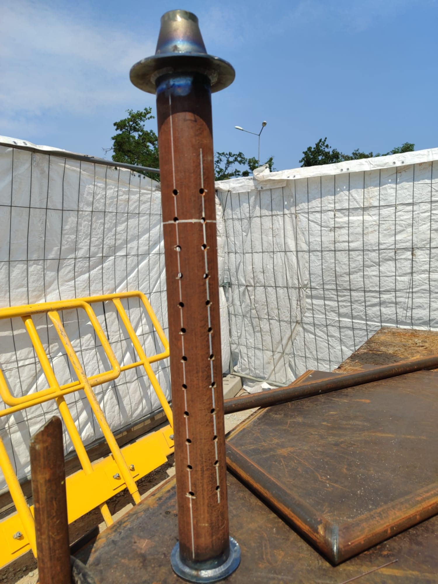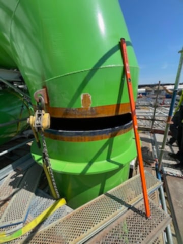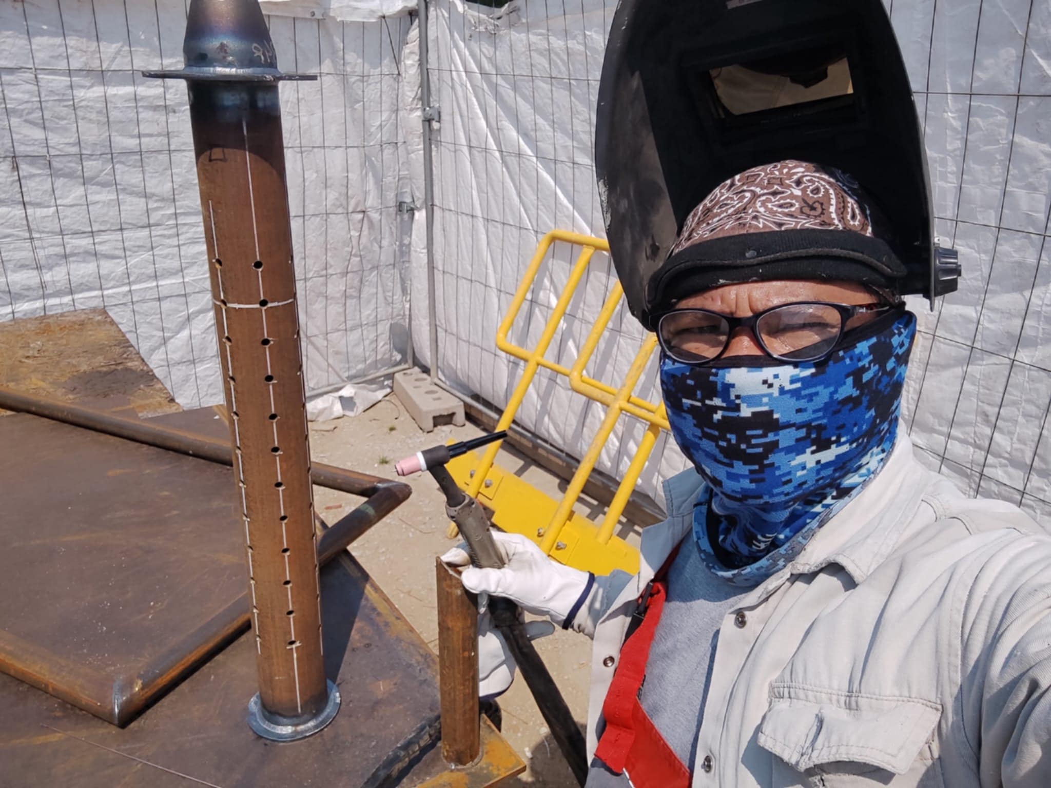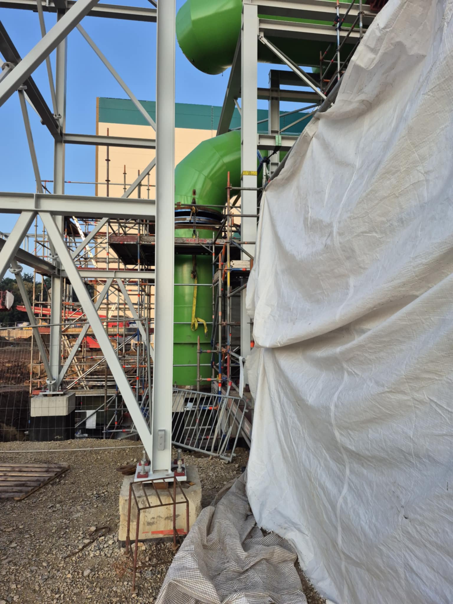 Spawanie konstrukcji wsporczej na potrzeby montażu oblachowania komina i kanału wlotowego do komina na projekcie CCGT Ostrołęka.